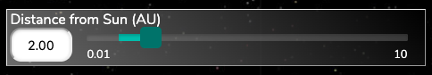 Once again, open the Planetary Climates learning tool, navigate to the 'Build A Planet' learning tool, and begin by creating Earth's conditions (as described above). Then change the 'Distance from Sun' slider from 1 AU to 2 AU as shown on the right.
