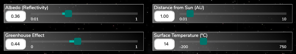 Let’s consider how incoming radiation affects the overall radiation balance of the Earth. Open the Planetary Climates learning tool and navigate to the 'Build A Planet' learning tool by clicking 'Go To' at the top and then 'Build A Planet'. Enter the following conditions to create Earth (you can click on the input boxes to manually enter a number):