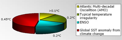 Analysts portioned out the factors that contributed to the unusually high SST anomaly of this year. You can see how much of the anomaly is attributed to each contributing factors in the pie graph to the right. This graph can be used to answer the question above.