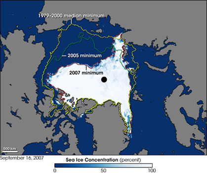 As shown in the picture above, Arctic sea ice minima have steadily retreated towards the pole since the 1970s due to warming oceans and melting ice. Reduced sea ice in the passage is hindering the ability of some carnivorous species (such as polar bears and seals) to maintain their traditional feeding territories. It has also allowed Pacific species such as the gray whale and a plankton species to migrate across to the North Atlantic Ocean.